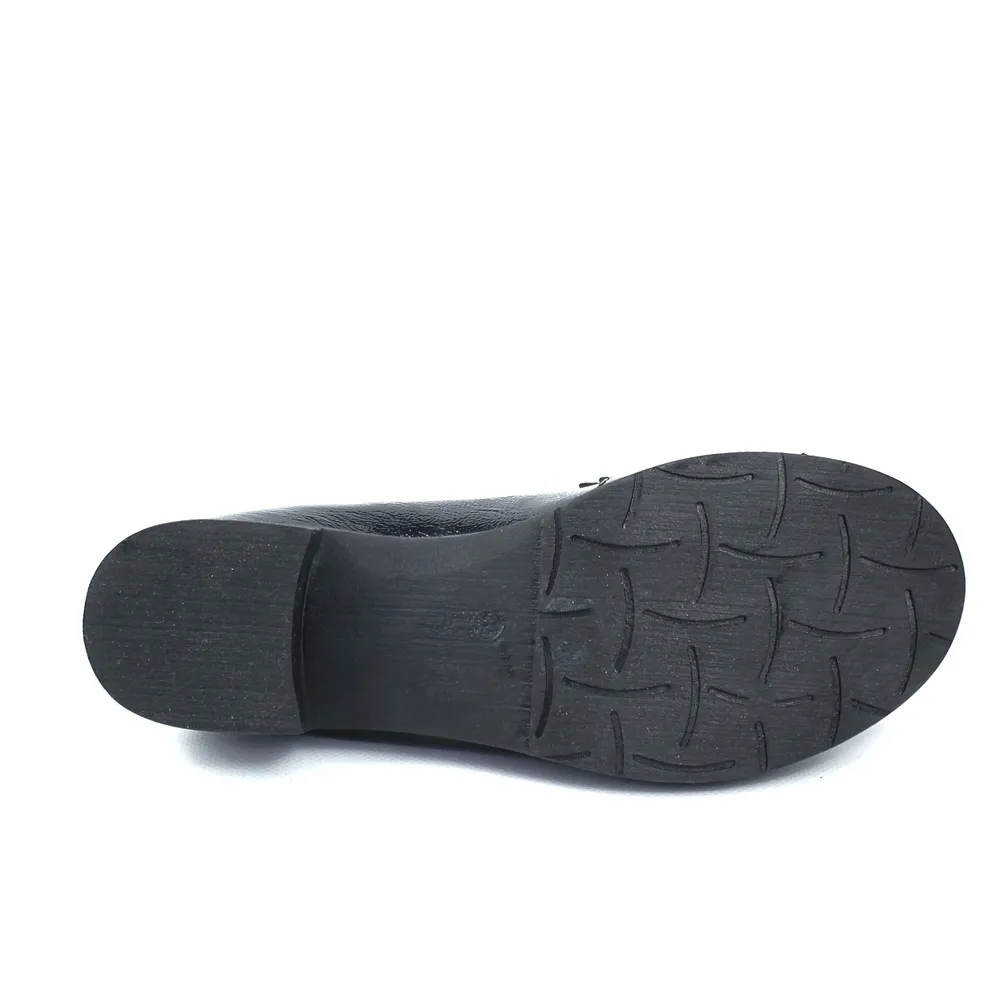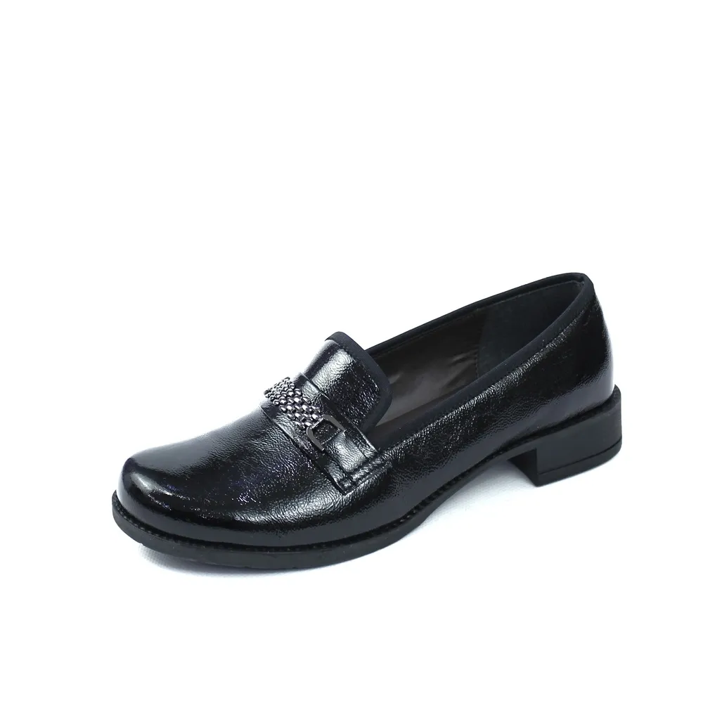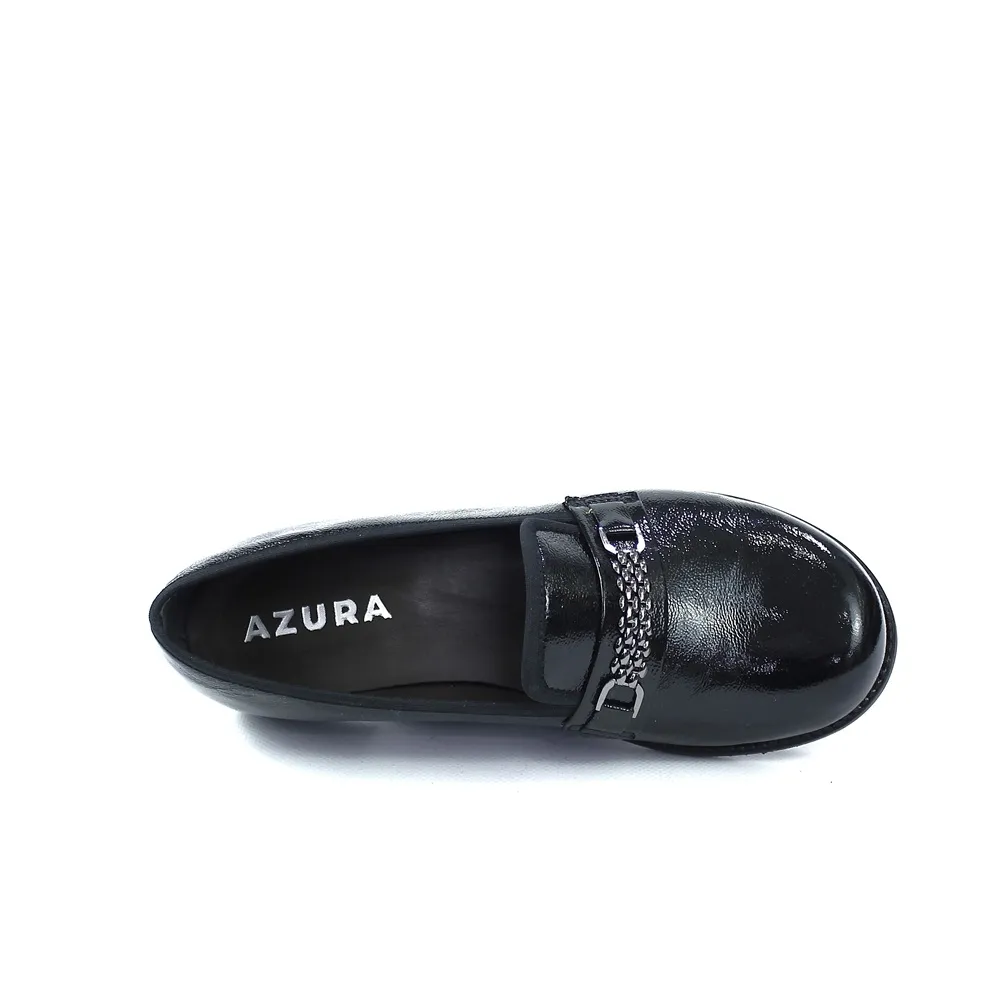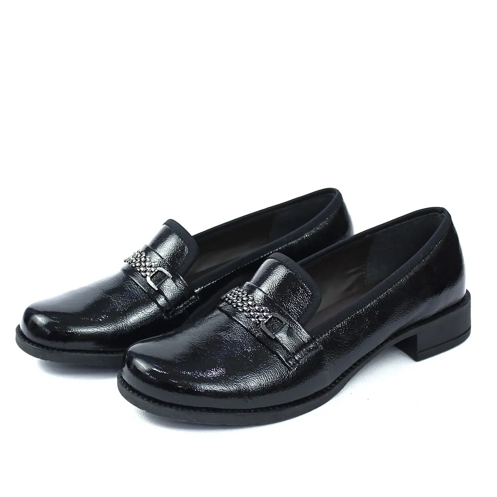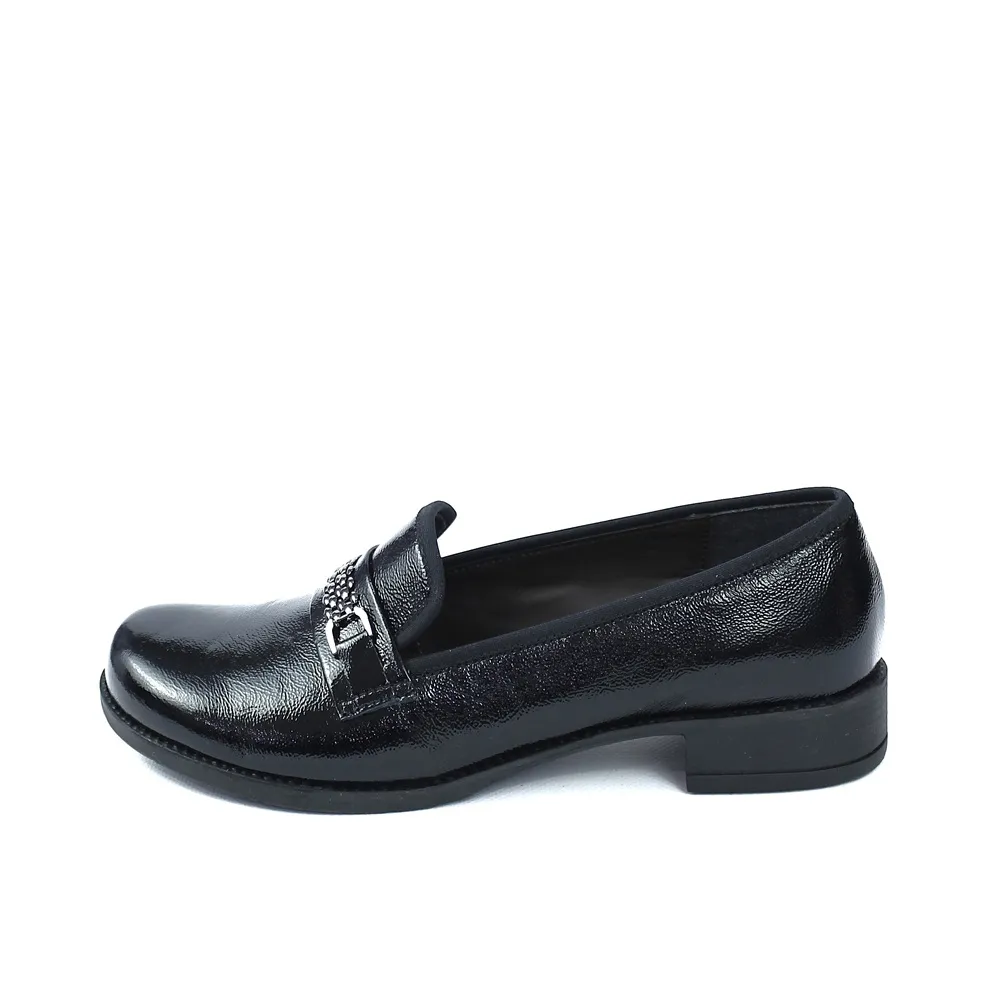 Moderan i chic model mokasina koji spaja udobnost i glamur. Izrađene su od visokosjajne lak kože u crnoj boji a ukrasni remen sa metalnim detaljem lanca i štrasa koji donosi dašak prefinjenog stila. Stabilna, niska peta čini ih idealnim za cjelodnevno nošenje.
