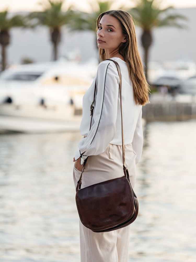 Izrađena je od visokokvalitetne glatke kože koja ima prirodan, blago teksturiran izgled. Površina blago reflektujje svjetlost, jer je koža tretirana posebnim uljima i voskovima (tzv. polished leather), pružajući joj otpornost i sofisticiran završni sloj. Rubovi su precizno prošiveni koncem u sličnom tonu, što dodatno učvršćuje konstrukciju.