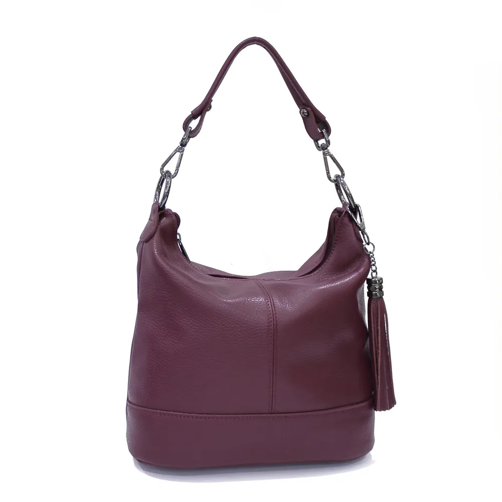 Torba je izrađena od mekane, ali izdržljive kože s naglašenom teksturom koja s vremenom postaje još ljepša. Vertikalni središnji šav vizualno izdužuje siluetu, dok robusna ručka sa metalnim alkama osigurava udobno nošenje na ramenu. Poseban pečat daje joj dekorativni privjesak u obliku kićanke koji se može skinuti.