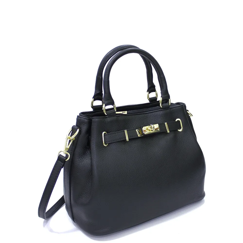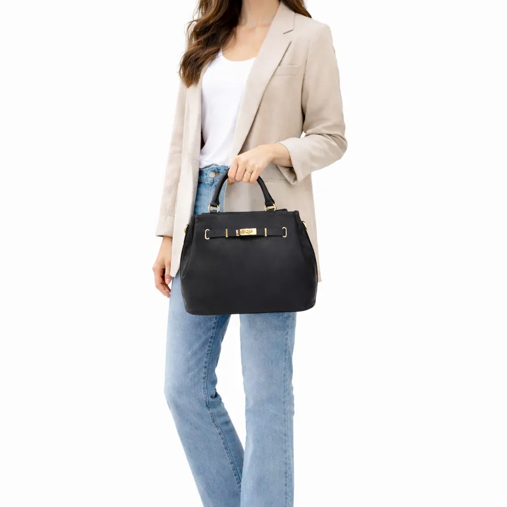 Centralni dio dizajna je ukrasni kožni kaiš na prednjoj strani sa elegantnom zlatnom kopčom, koji torbi daje notu ozbiljnosti i luksuza. Zlatni okovi na spojevima ručki dodatno naglašavaju pažnju posvećenu detaljima, dok zaobljene ručke omogućavaju udobno nošenje u ruci.