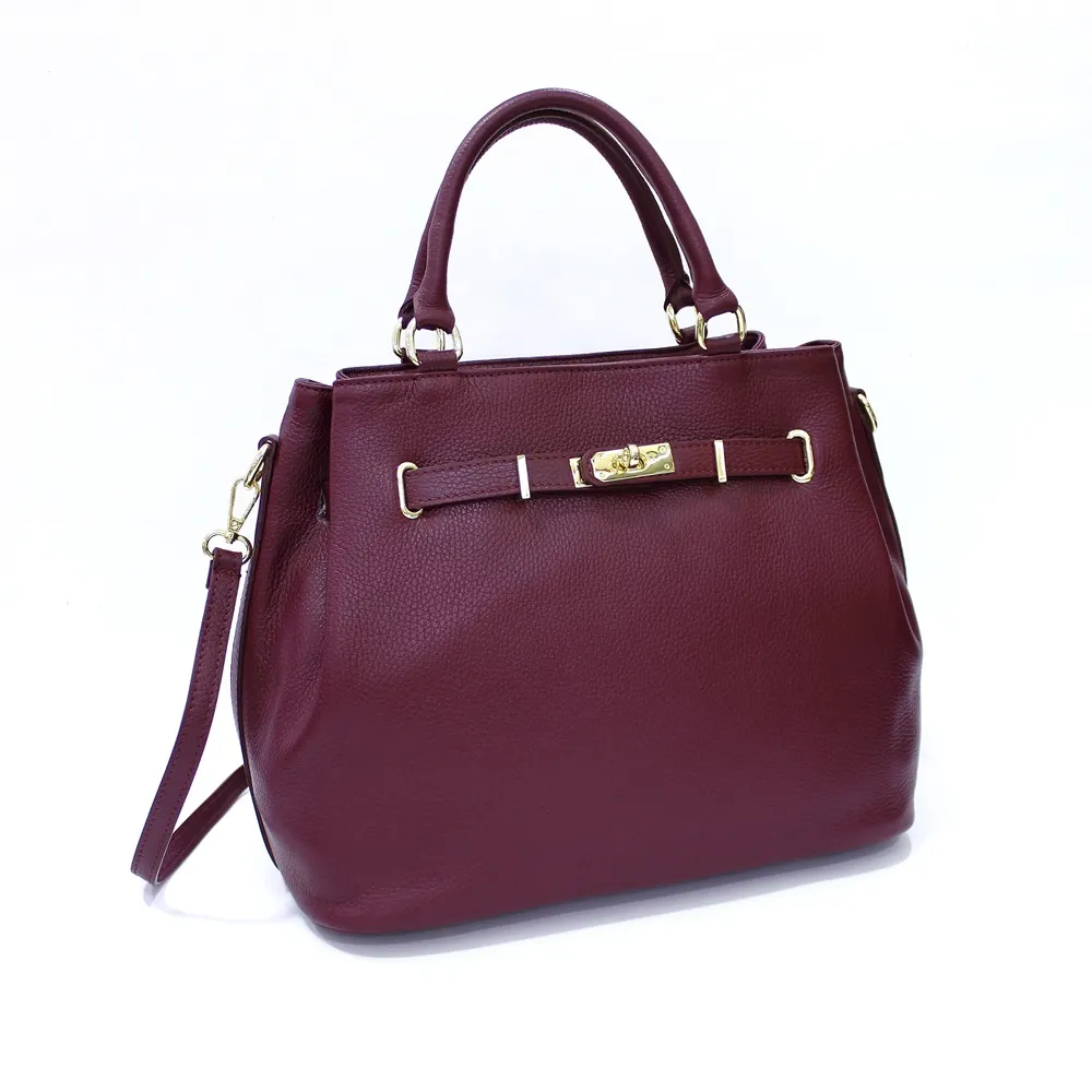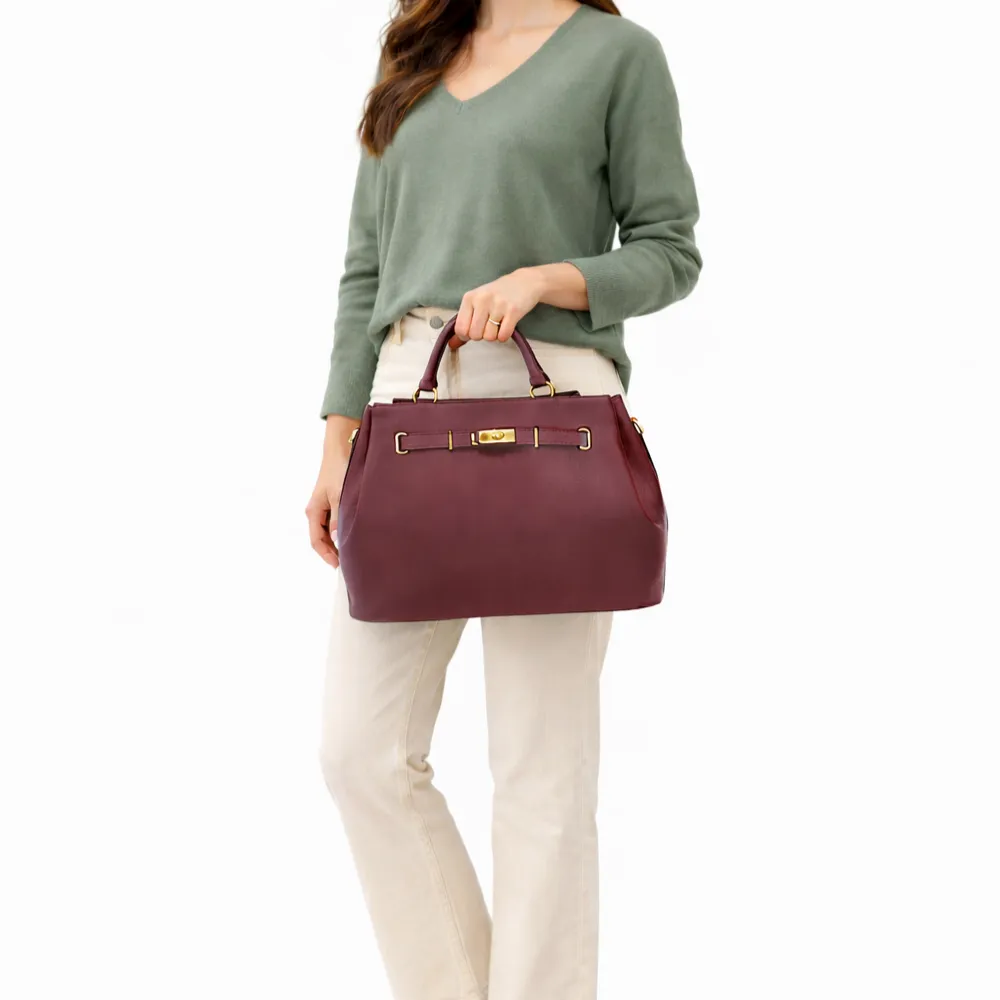 Centralni deo dizajna je ukrasni kožni kaiš na prednjoj strani sa elegantnom zlatnom kopčom, koji torbi daje notu ozbiljnosti i luksuza. Zlatni okovi na spojevima ručki dodatno naglašavaju pažnju posvećenu detaljima, dok zaobljene ručke omogućavaju udobno nošenje u ruci.