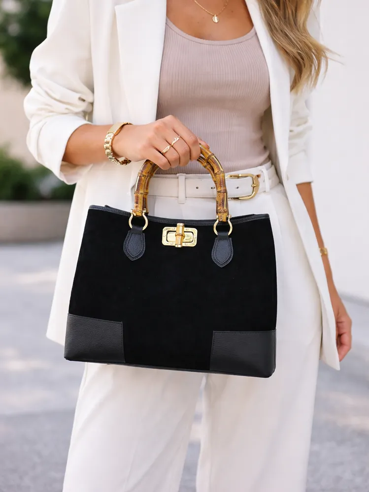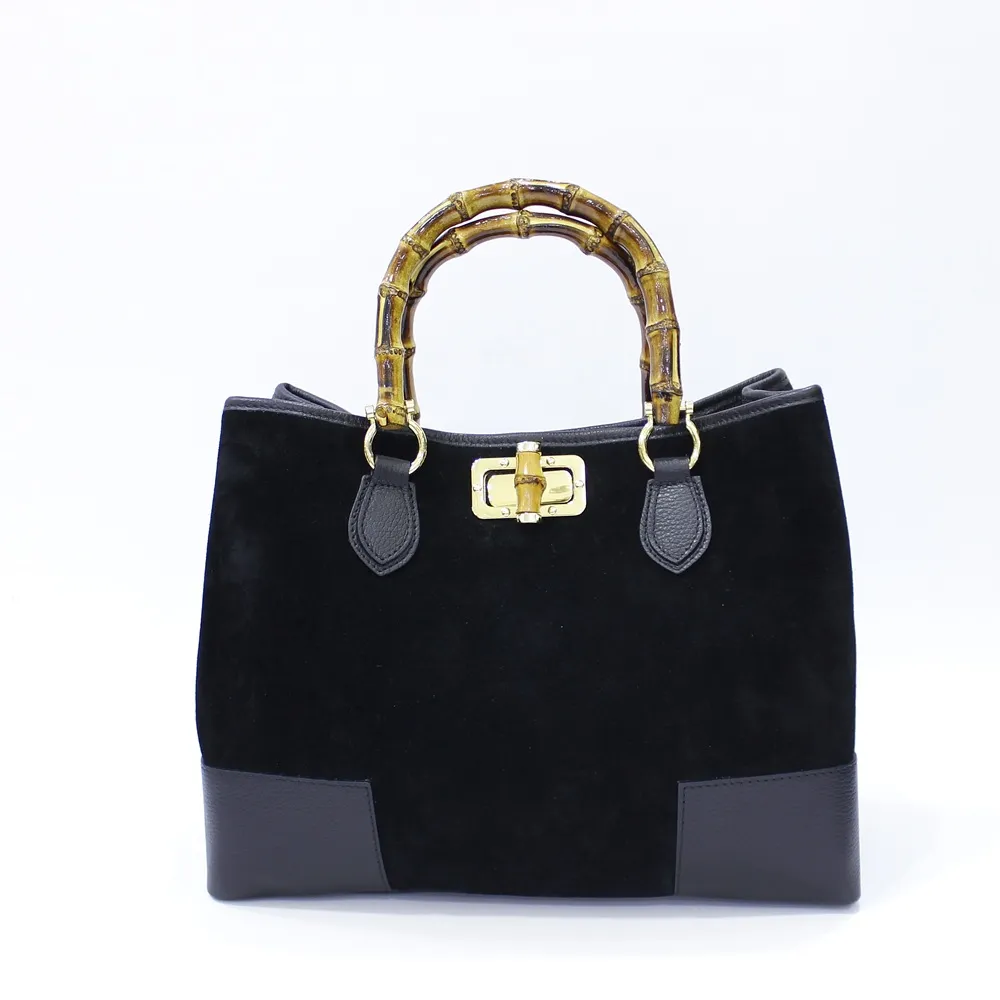 Elegantna ženska torba od prirodne kože i velura , sa dekorativnom bambus drškom i dodatnim kaišem. Praktična i idealna za dnevne i večernje prilike.