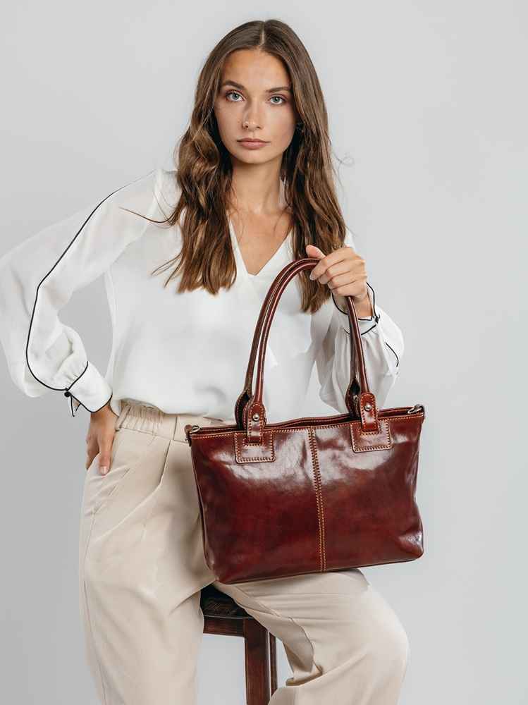 Velika italijanska kožna torba odiše elegancijom i praktičnošću. Izrađena je od najkvalitetnije kože, sa glatkom teksturom i diskretnim sjajem, što joj daje luksuzan izgled. Tašna ima dvije čvrste ručke koje omogućavaju nošenje u ruci ili preko ramena sa odvojivim kajišem. Unutrašnjost je pažljivo osmišljena: sadrži dva odvojena odjeljka sa pregradom i dodatni džep sa rajsferšlusom za sigurno čuvanje sitnijih predmeta. Prostranost tašne omogućava lako smještanje dokumenata A4 formata, laptopa i drugih osnovnih stvari, što je čini idealnom za poslovne i svakodnevne potrebe. Njena sofisticirana izrada i praktičan dizajn čine je savršenim dodatkom za sve prilike
