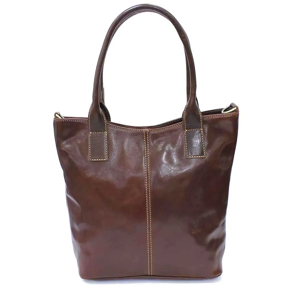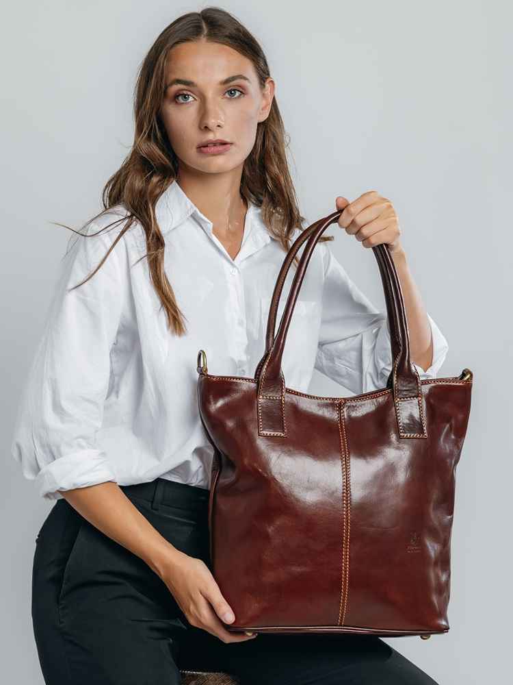 Velika italijanska kožna torba koja odiše elegancijom i praktičnošću. Izrađena je od najkvalitetnije kože, sa glatkom teksturom i diskretnim sjajem, što joj daje luksuzan izgled. Torba ima dvije čvrste ručke koje omogućavaju nošenje u ruci ili preko ramena sa odvojivim kaišem. Unutrašnjost je pažljivo osmišljena: sadrži dva odvojena odjeljka sa pregradom i dodatni džep sa rajsferšlusom za sigurno čuvanje sitnijih predmeta. Prostranost tašne omogućava lako smještanje dokumenata A4 formata, laptopa i drugih osnovnih stvari, što je čini idealnom za poslovne i svakodnevne potrebe. Njena sofisticirana izrada i praktičan dizajn čine je savršenim dodatkom za sve prilike