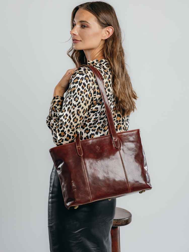 Ova elegantna torba u bogatoj nijansi konjaka izrađena je od vrhunske polirane kože koja odiše bezvremenskim stilom. Sa dugim ručkama za udobno nošenje preko ramena i prostranom unutrašnjosti, idealan je saputnik za poslovne sastanke, putovanja ili svakodnevne obaveze. Prefinjeni detalji poput kontrastnih štepova čine je nezaobilaznim komadom u kolekciji svake moderne žene.