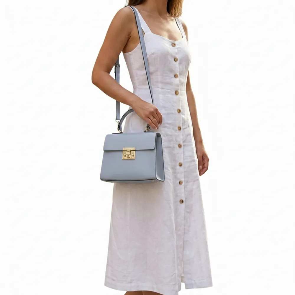 Iako kompaktnog oblika, ovaj model nudi dovoljno prostora za vaše osnovne stvari. Fiksna gornja ručka omogućava nošenje u ruci za maksimalno elegantan efekat, dok odvojivi kožni kaiš nudi slobodu kretanja i crossbody opciju za opuštenije prilike.