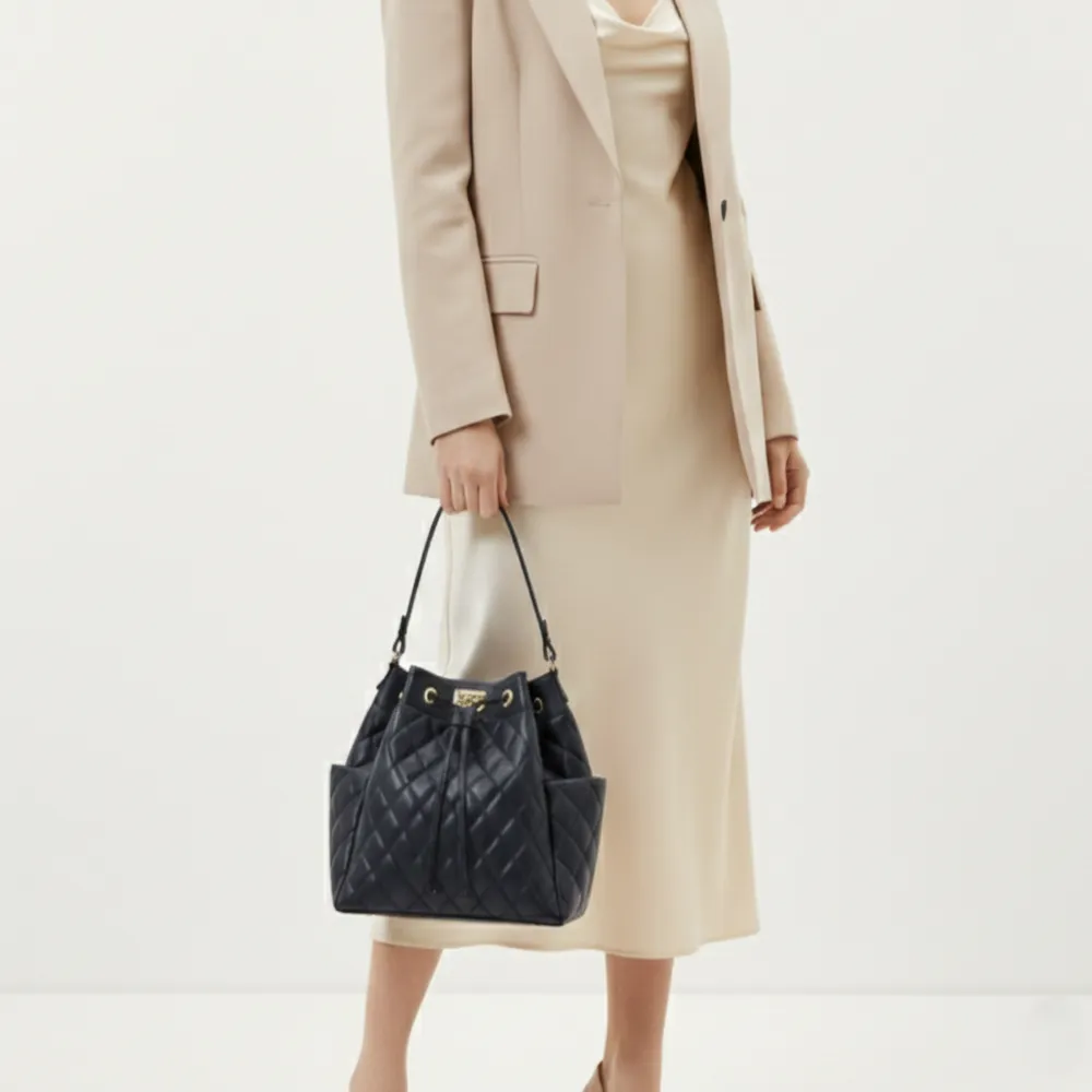 Torba se zatvara pomoću ukrasnog učkura i luksuzne metalne kopče u boji zlata, što joj daje specifičan „bucket“ oblik.