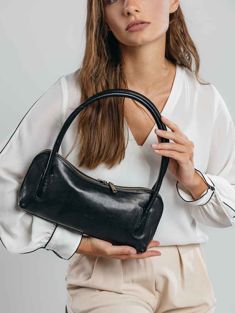 Neobična torbica, . zaobljene linije dominiraju dizajnom i daju laku notu minimalizma samoj formi,a dvije ručke su kreirane za nošenje na ramenu ili u ruci. Unutrašnjost pruža sasvim dovoljno prostora za Vaše neophodne sitnice.